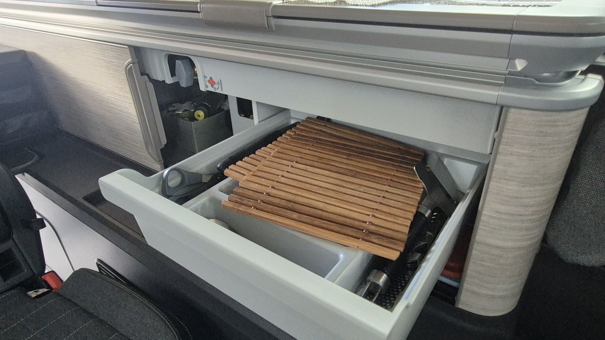 Ontdek het gemak van koken onderweg met de compleet ingerichte keuken van de Volkswagen T7 California Coast. Deze slimme camperkeuken is ontworpen voor maximaal vier personen en biedt alles wat je nodig hebt om zorgeloos te genieten van ontbijt tot diner – waar je reis je ook brengt.