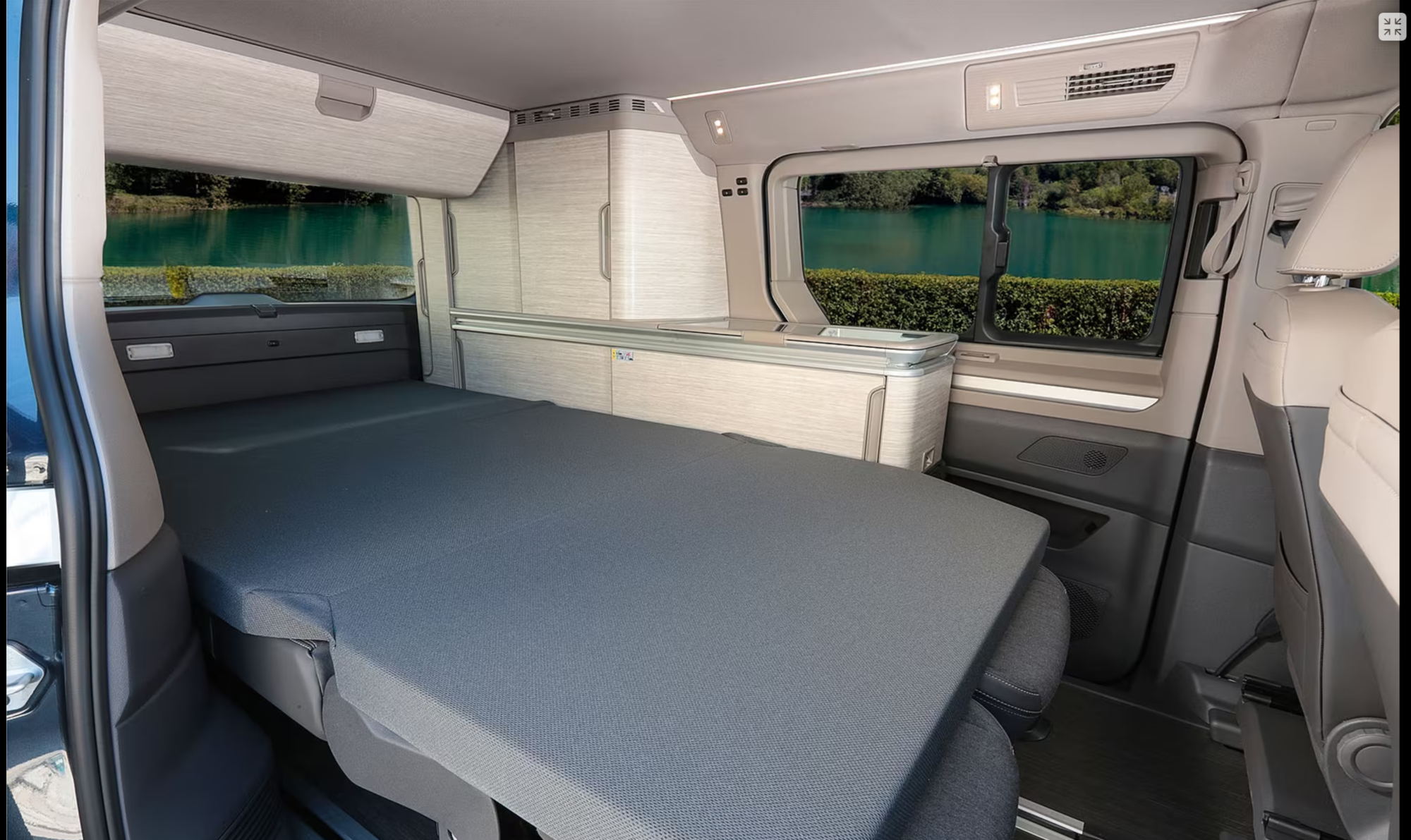Slaap comfortabel in de Volkswagen T7 California Coast, met een slimme indeling voor maximaal vier personen. Beneden ontstaat een tweepersoonsbed van ongeveer 198 x 106 cm door de individuele achterstoelen naar voren te schuiven en neer te klappen, waarna je het geïntegreerde matras eenvoudig uitvouwt. Dit bed is ideaal voor twee volwassenen of een ouder met kind, en maakt optimaal gebruik van de ruimte in het woongedeelte.